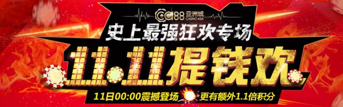 钜惠双十一 CA88狂欢节 2015-11-04 • 优惠活动 • 1 条评论 活动时间:2015-11-11(GMT+8 北京时间) 活动内容: 令人抓狂的“剁手日”即将来临! 双十一网络狂欢节,掩盖了光棍节的孤单和哀伤, 岁月正好,亚洲城也将参与其中,为所有玩家带来一份心意,让所有人真正感受到这场全民狂欢的盛宴。 双十一当天参与亚洲城存款将获得以下优惠 当天单笔存款金额 次日获得奖金 单笔存