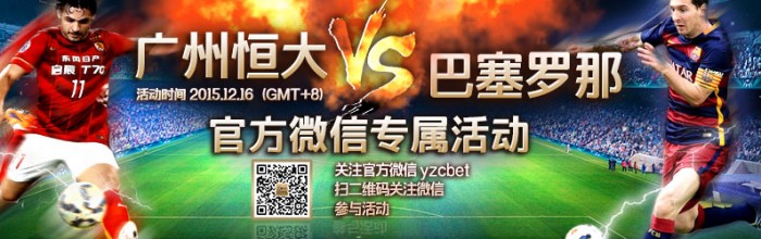 【微信专属优惠】中国广州恒大 VS巴萨罗那 2015-12-16 • 优惠活动 • 2 条评论 12月17日18.30 中国广州恒大 VS巴萨罗那 恒大待奇迹! 勇夺取亚冠冠军后,广州恒大获得了代表亚洲参加今年世俱杯的资格。这也将是恒大自2013年之后第二次参加该项赛事,随着恒大击败墨西哥美洲成功晋级,他们将在半决赛对阵欧洲冠军巴萨罗那。亚洲第一VS欧洲第一,恒大未赢够!现在关注亚洲城微信公众号发送互动口号为