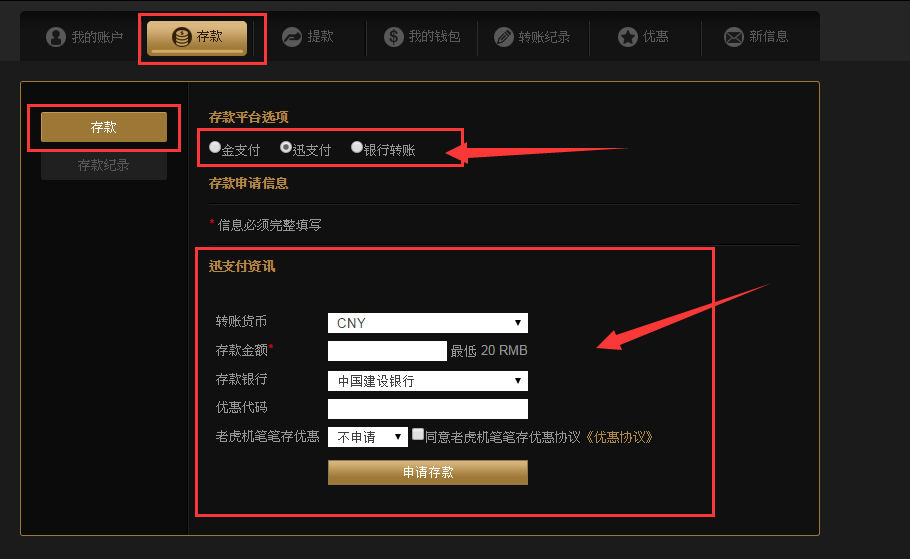 我们的存款平台多样化,请您以目前网站上现有的存款方式进行存款