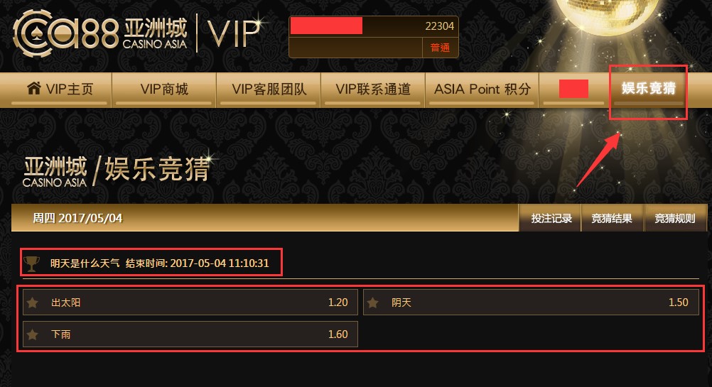②点击“娱乐竞猜”将会看到竞猜题目,竞猜结束时间,竞猜选项(选项后的数字既该选项的赔率)