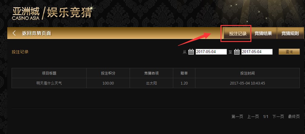 项目标题 投注积分 竞猜选项 赔率 投注时间