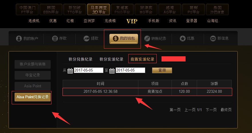 ⑥若您需要查询积分情况。可点击“我的钱包”→“Aisa Point兑换记录”→“竞猜派发记录”选好时间,点击查询就可以看到啦。
