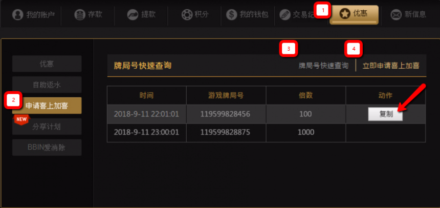 登入后先点击我的帐户,再按照以下四个步骤操作,便可快速查询当日符合申请喜上加喜的游戏牌局号。