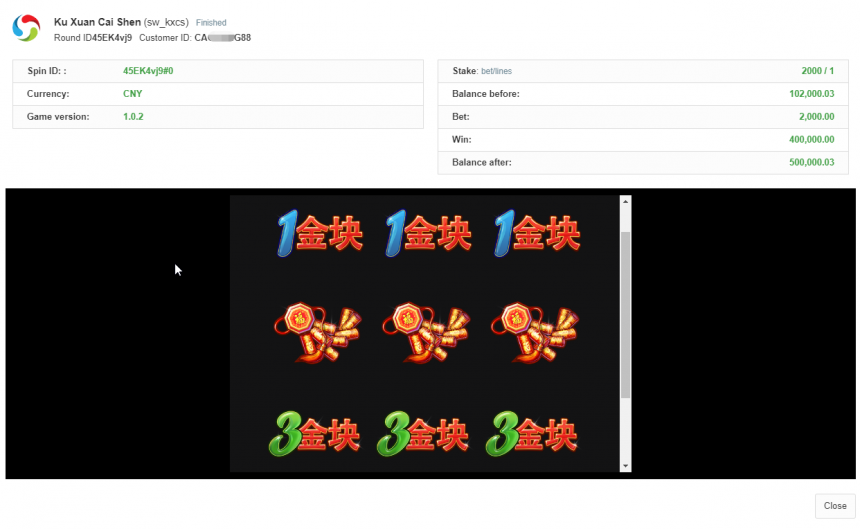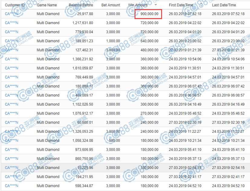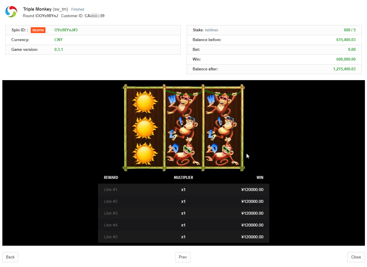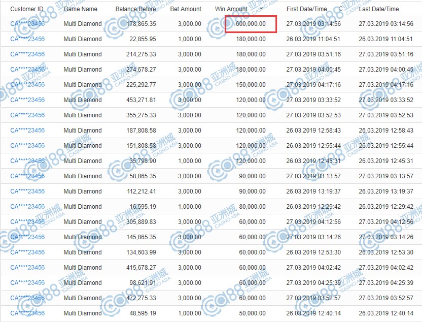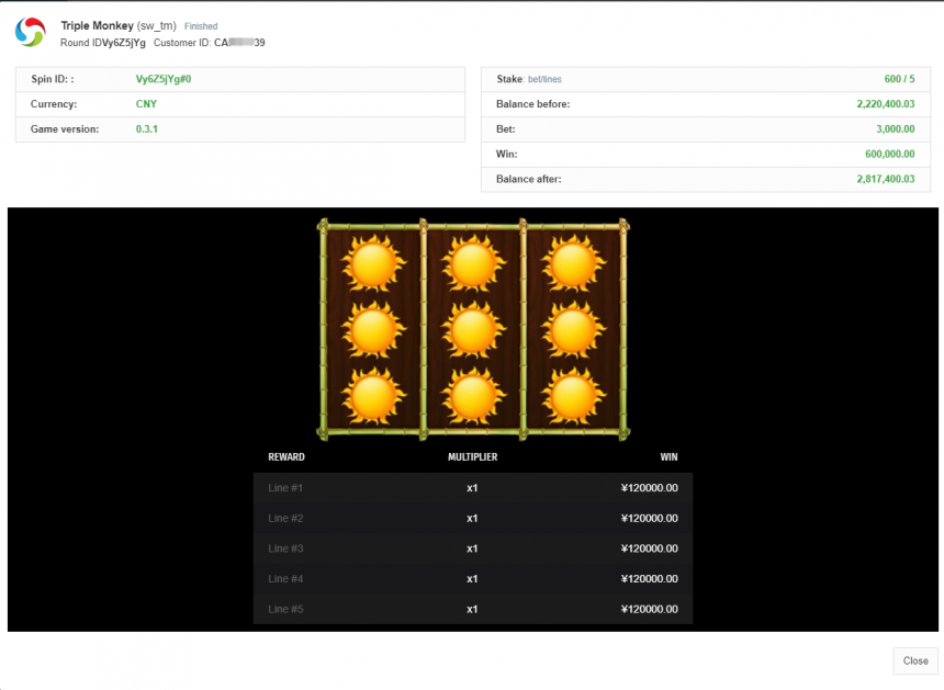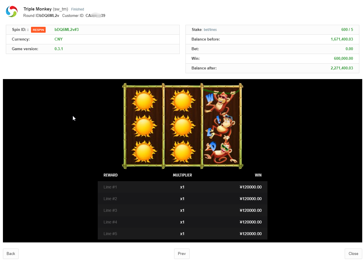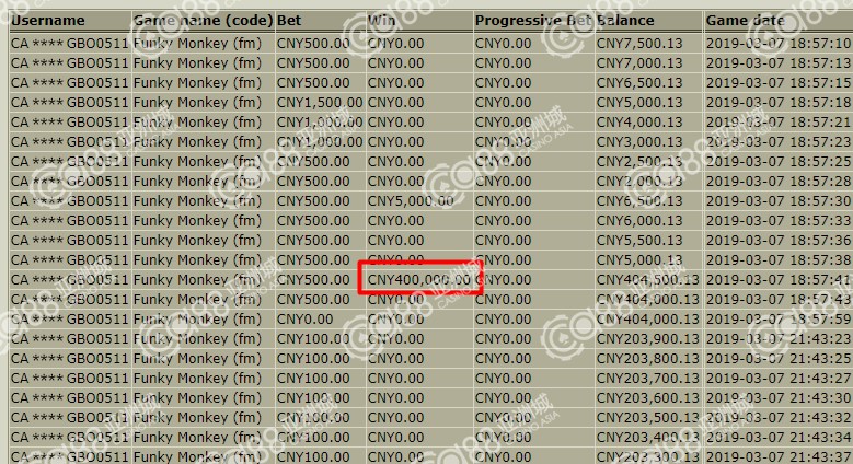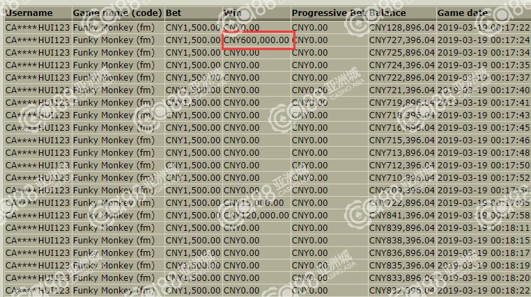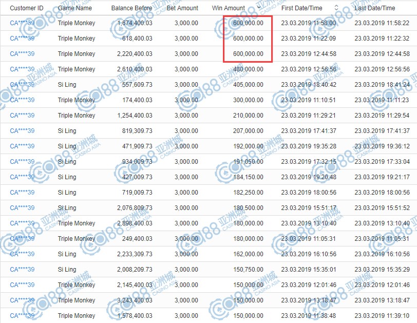 获奖情节:SW热门老虎机《三倍猴子》这次依然不缺席,3月23日来自安徽的任先生以单局3000投注全押中了不少高倍赔彩,尤其是60万。第1次是转出9个太阳,第2次是6个太阳3只猴子,第3次是3个太阳6只猴子。不愧是亚洲城的5年青龙玩家,但很可惜任先生跟NO.1的刘小姐来对比还差一点点运气。
