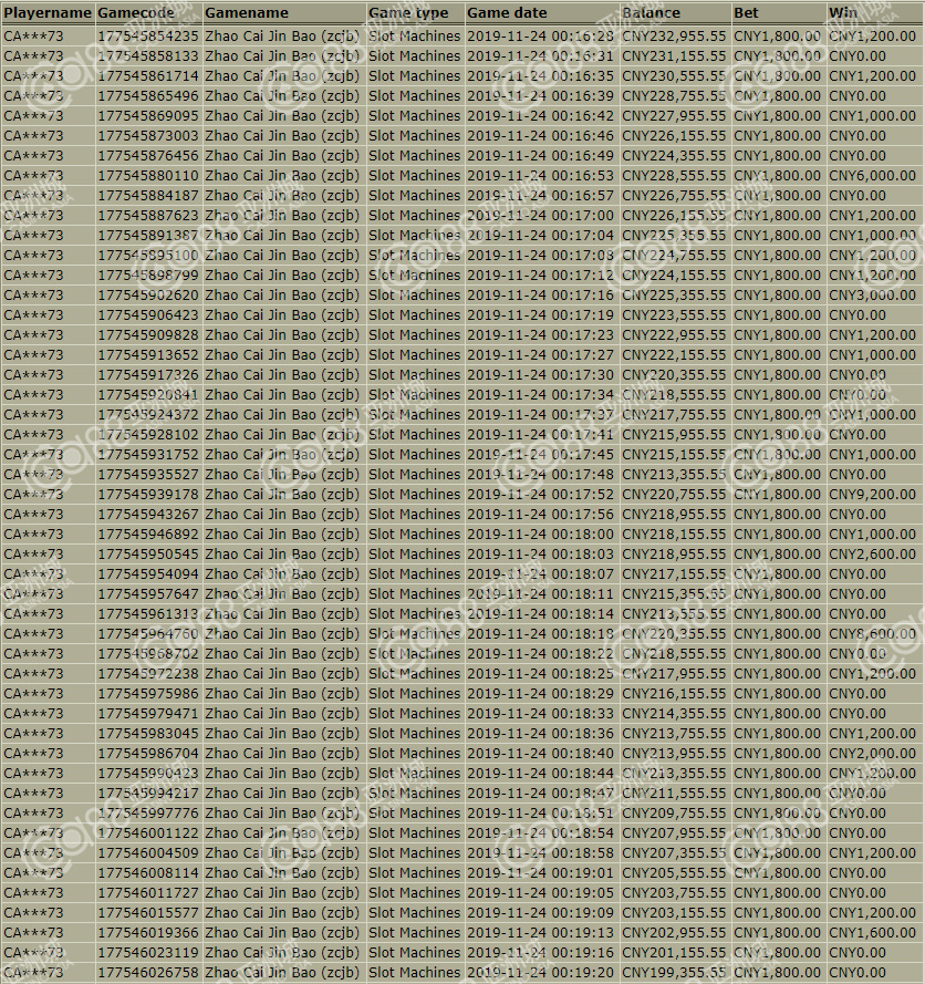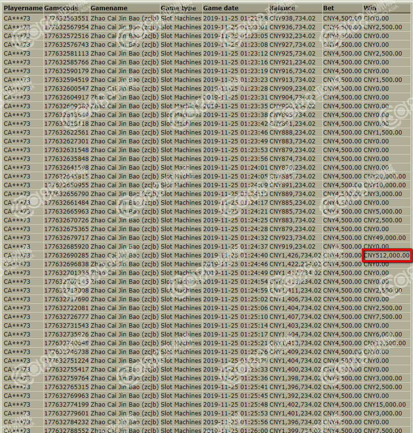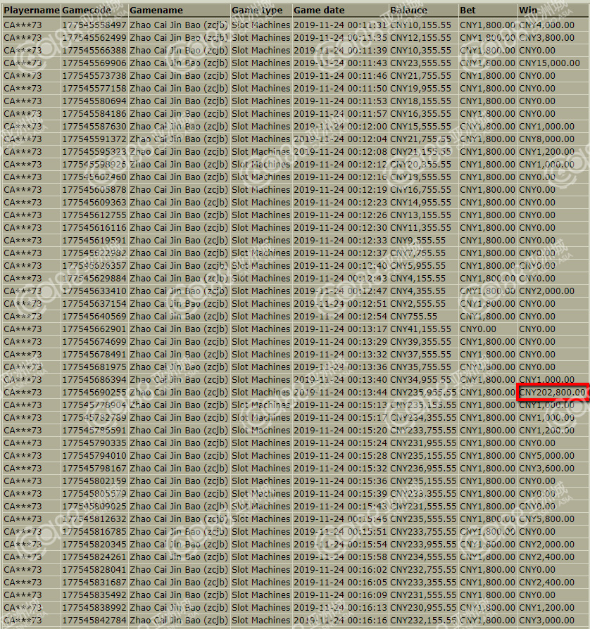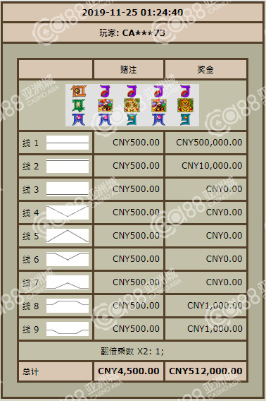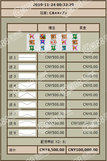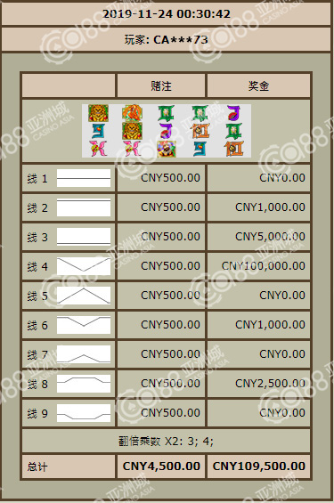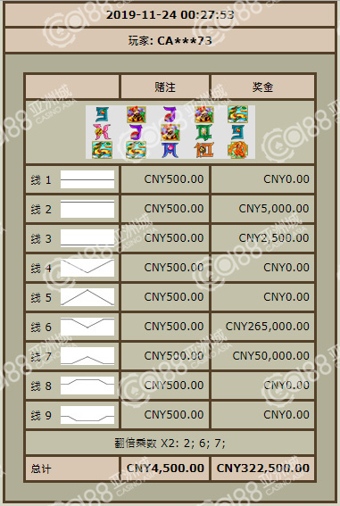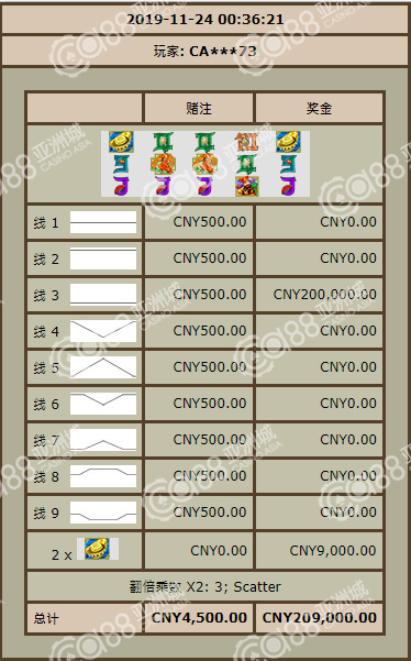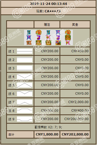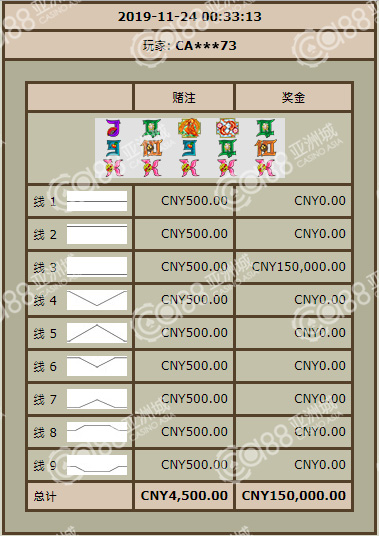 再来看到这次玩家的获奖资讯,最令小亚感到佩服的是玩家在刚开始游戏之时,本金只有几千的状况下,仍以每注几百元不等的金额投注,虽说这注额有大有小,但玩家是真以拼了的心情下与财神爷爷博一回的!