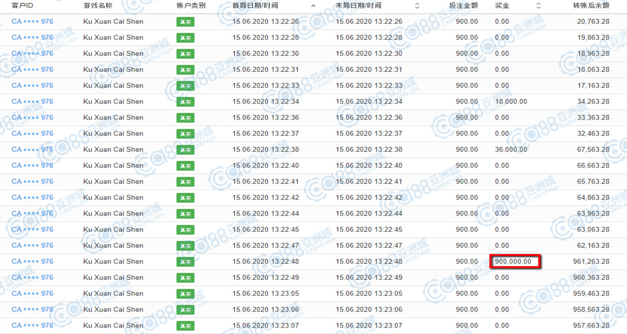 获奖情节:本期第一名的宝座,是单笔一举赢得90万大奖的玩家,不会让人意外的也是SW最热门的游戏之一,财神爷爷果然是眷顾喜欢找祂老人家叙旧的小伙伴,这款游戏的出奖率特别高,相信不需小亚提示,大家都知道的!