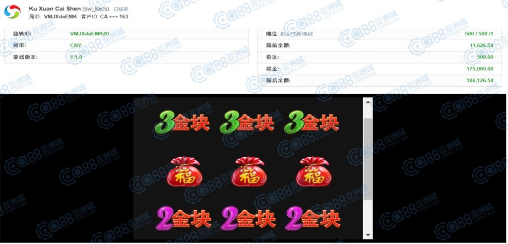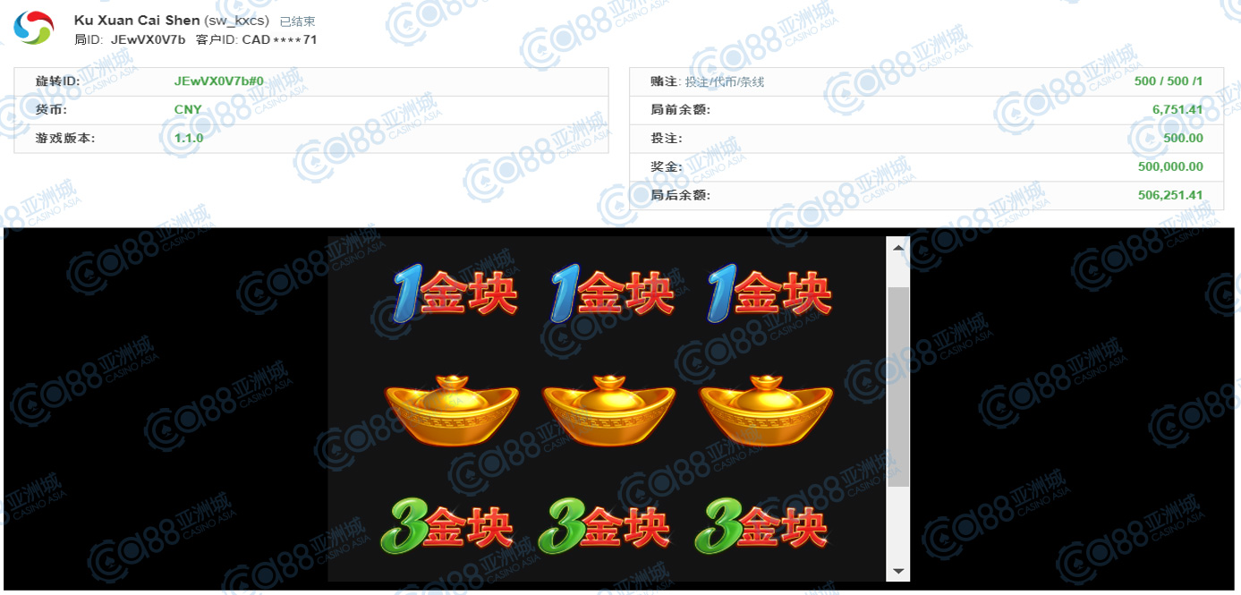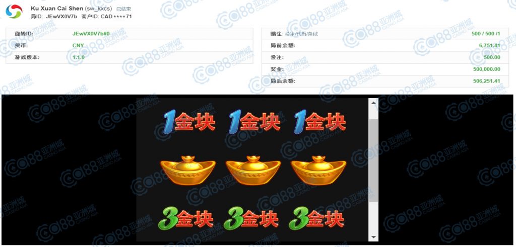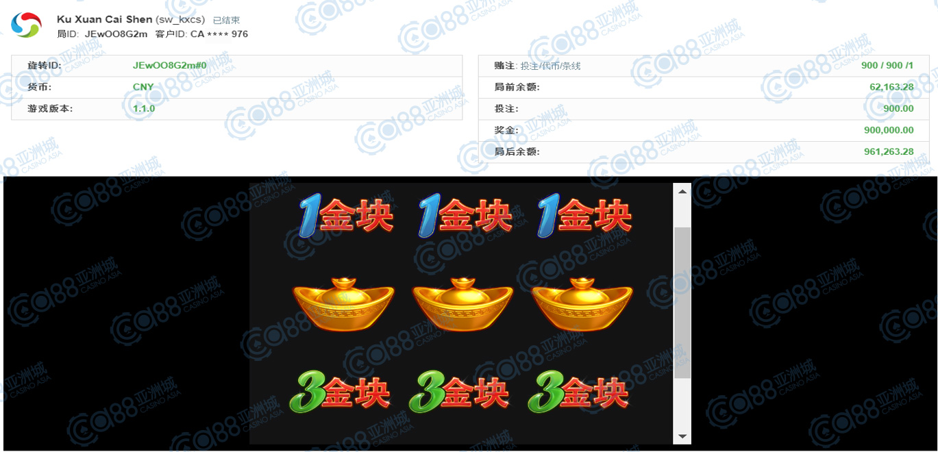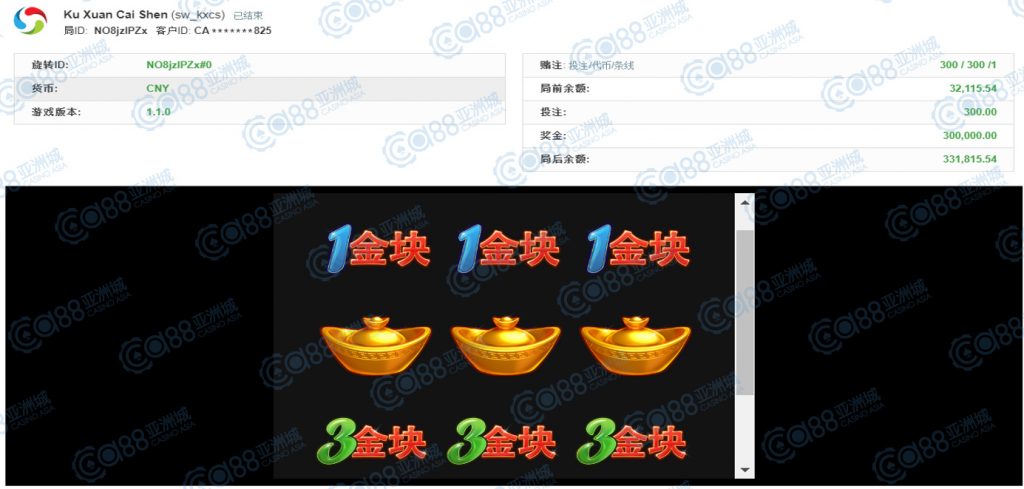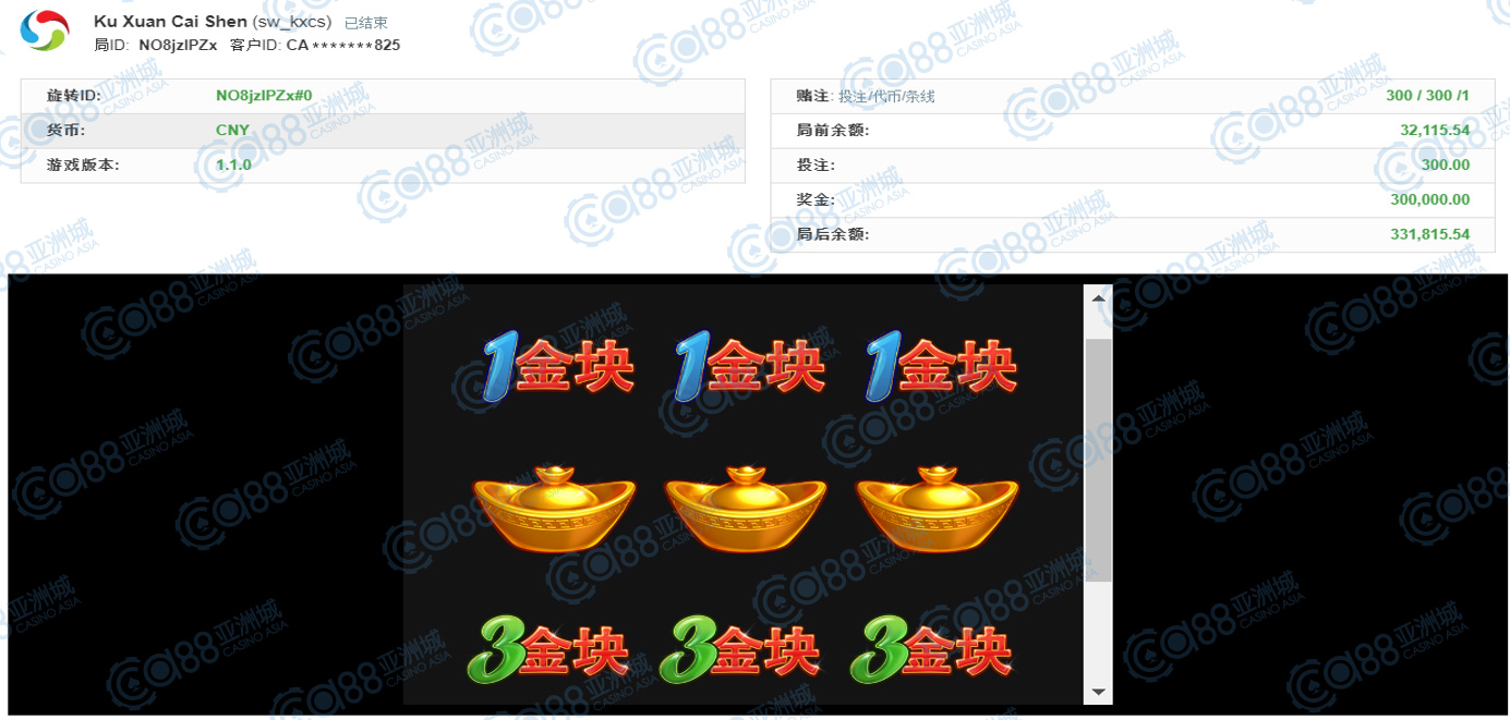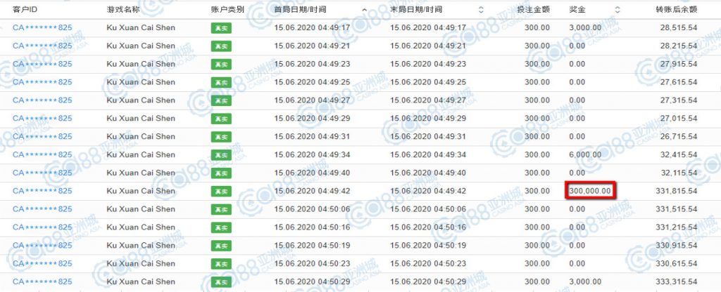 获奖情节: 再来又是咱的财神爷爷上身!虽然金额落在30万元,但依然是大奖单笔夺得,这中奖机会真不是天天都能出现的呢!一起恭喜第五名宝座的玩家,也请财神爷爷在多多眷顾您及在座小伙伴,每个人都要夺得大奖噢!