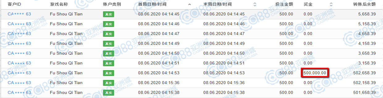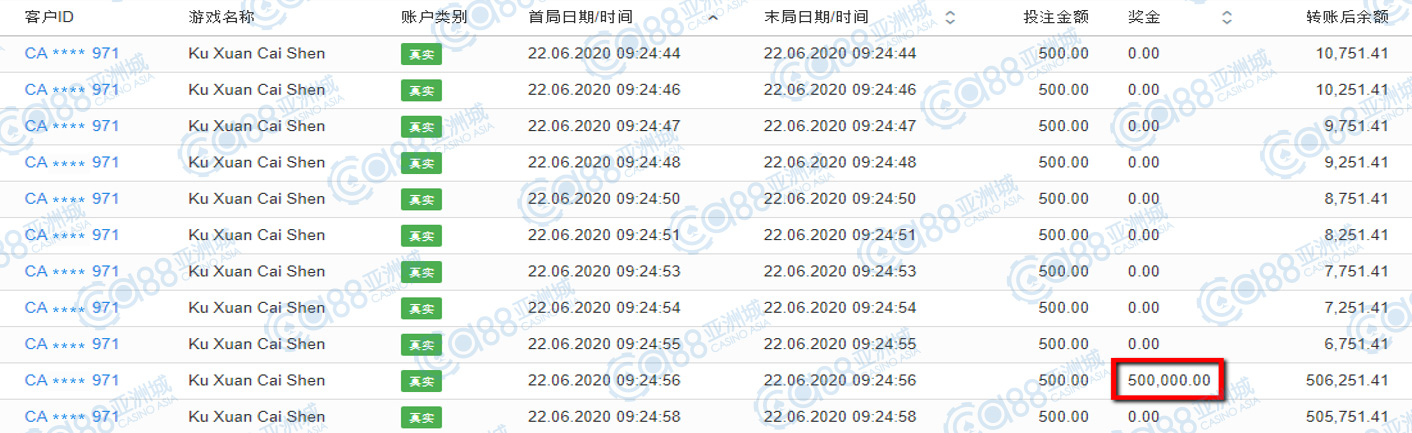 获奖情节:再来与第二名齐名的玩家,也是以50万高额奖金夺下这前三名宝座,不仅小伙伴羡慕,小亚也真是羡煞不已,这前三名的运气真不是一般的呢!都是单笔直接中奖超过50万,谢谢财神爷爷的眷顾了!