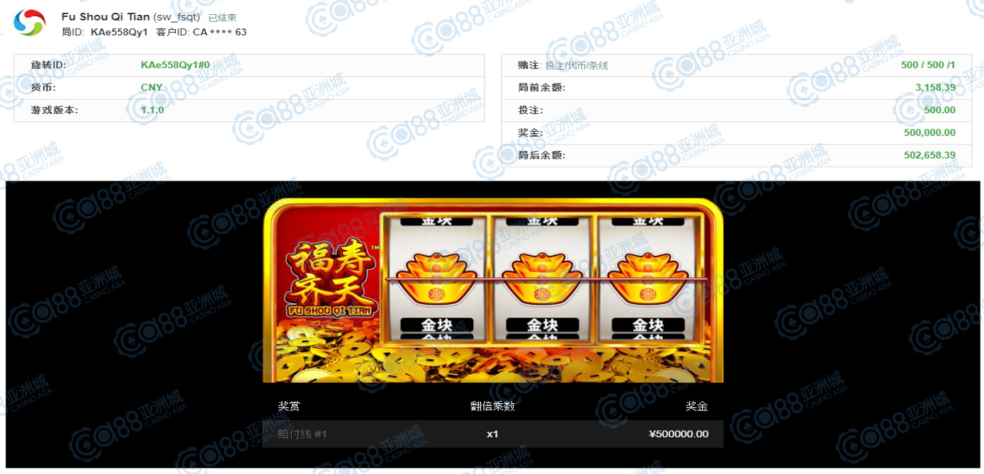 获奖情节: 再来是第二名宝座的玩家,福寿齐天这款游戏在小亚这特火,每每都出单笔大奖,最近更甚以往,玩家转到三个元宝就夺下整整50万元大奖,不仅可喜可贺还福寿齐天了,中奖小伙伴也分点福气给其他玩家吧!(笑)