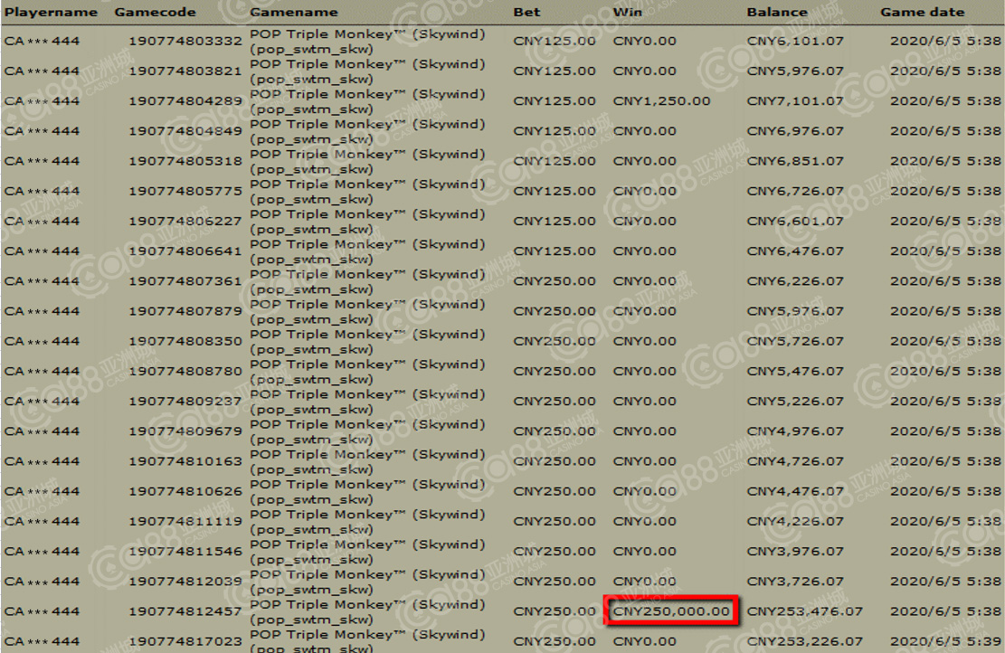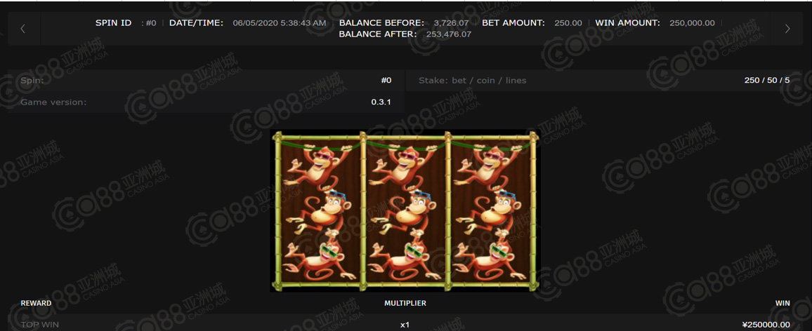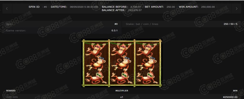 获奖情节:大家喜爱的三倍猴子游戏也来了,这次排名在第六名的宝座,以单笔25万夺得,恭喜得奖小伙伴,三倍猴子一直都是榜上热门游戏,除了赔率高,出奖率也好,正合咱小伙伴的心意!
